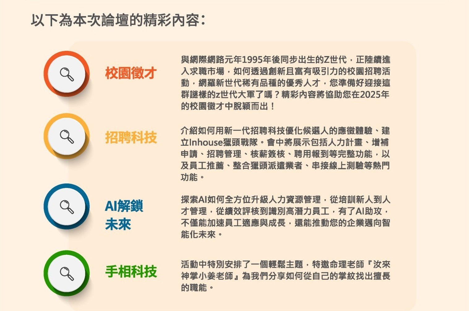本次論壇的議題豐富,針對校園徵才、招聘科技和AI 人資管理進行深入探討。從如何利用 AI 強化人力資源流程,到手相科技應用於人才特質的識別,這次論壇不僅提供理論,更帶來實際案例分析。現場還會與 IBM 等知名企業進行互動,分享成功經驗。