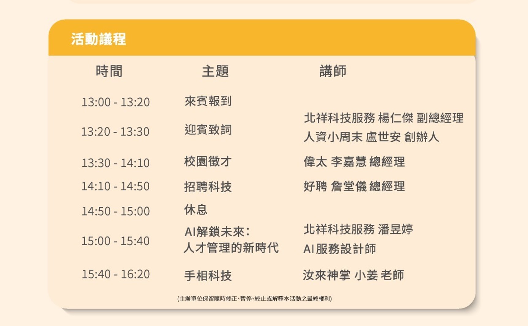 這是一場不可錯過的知識饗宴,將顛覆您對傳統招聘的想像,讓您更深入了解科技如何重塑人資管理的未來。立即報名,跟隨人資科技的腳步,搶先掌握未來人力資源的動向!