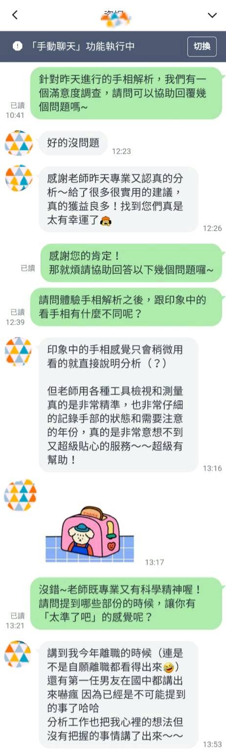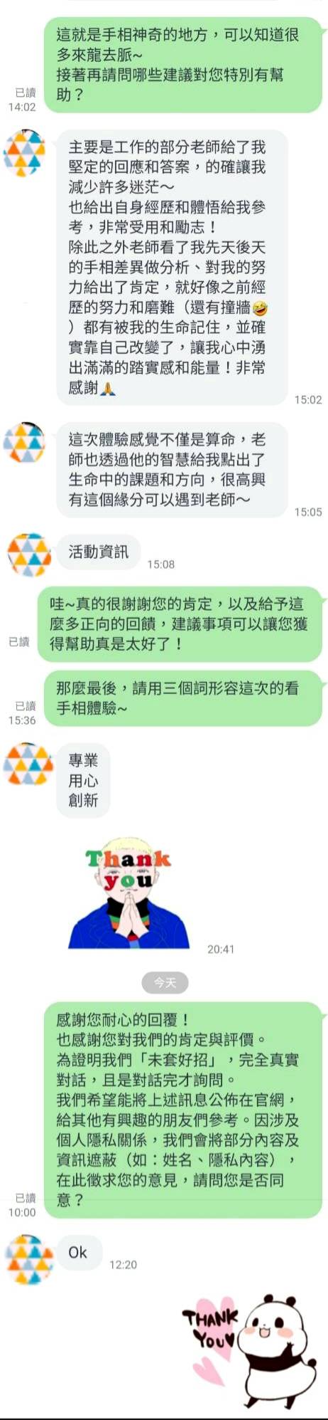 雖然每次看手相的流程相同,但每個人的人生故事都是獨特的,給予的回饋也不一樣!「老師用各種工具檢視和測量真的是非常精準,也非常仔細的記錄手部的狀態和需要注意的年份。」「分析工作也把我心裡的想法但沒有把握的事情講了出來~」「工作的部分老師給了我堅定的回應和答案,的確讓我減少許多迷茫也給出自身經歷和體悟給我參考,非常受用和勵志!」