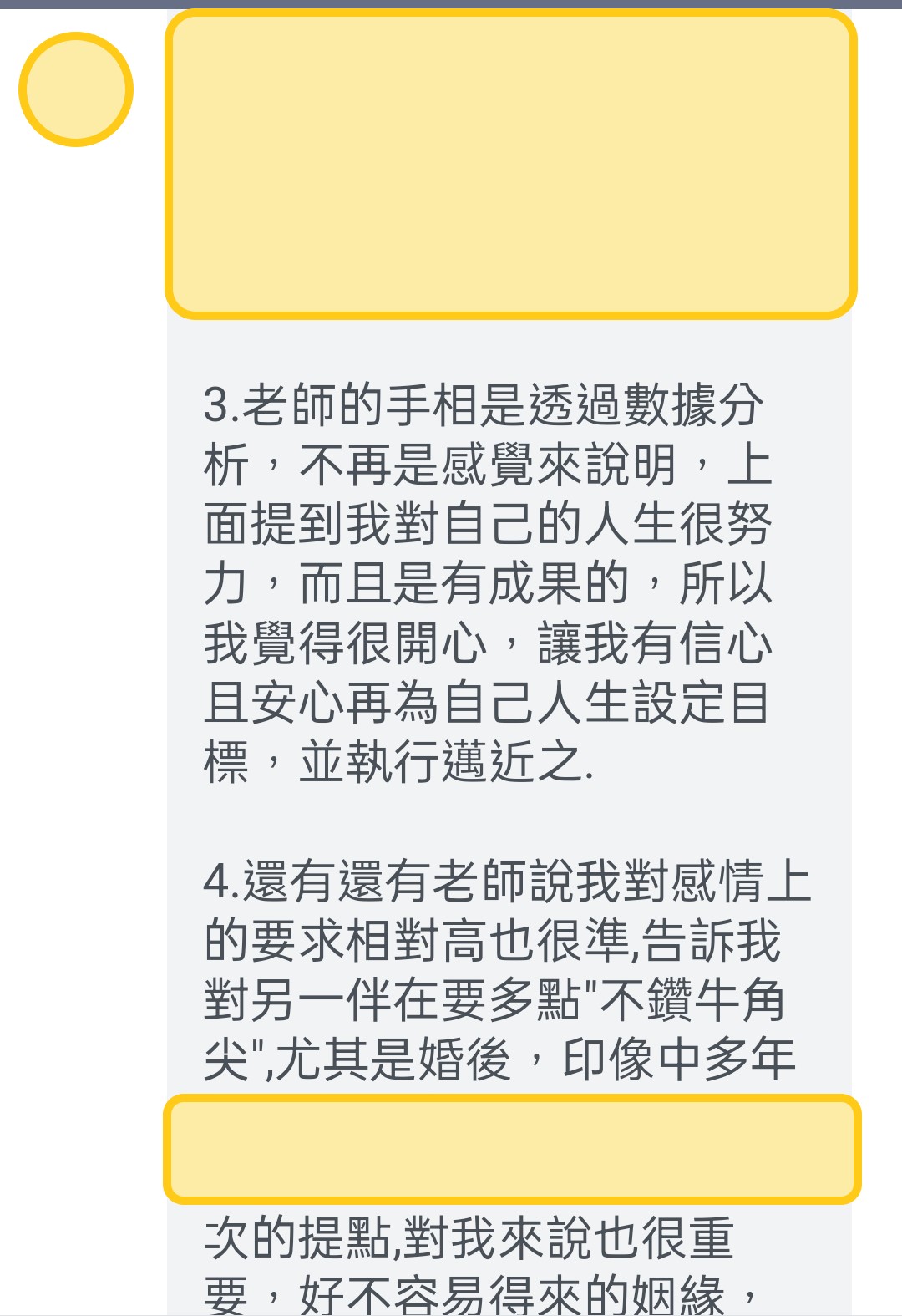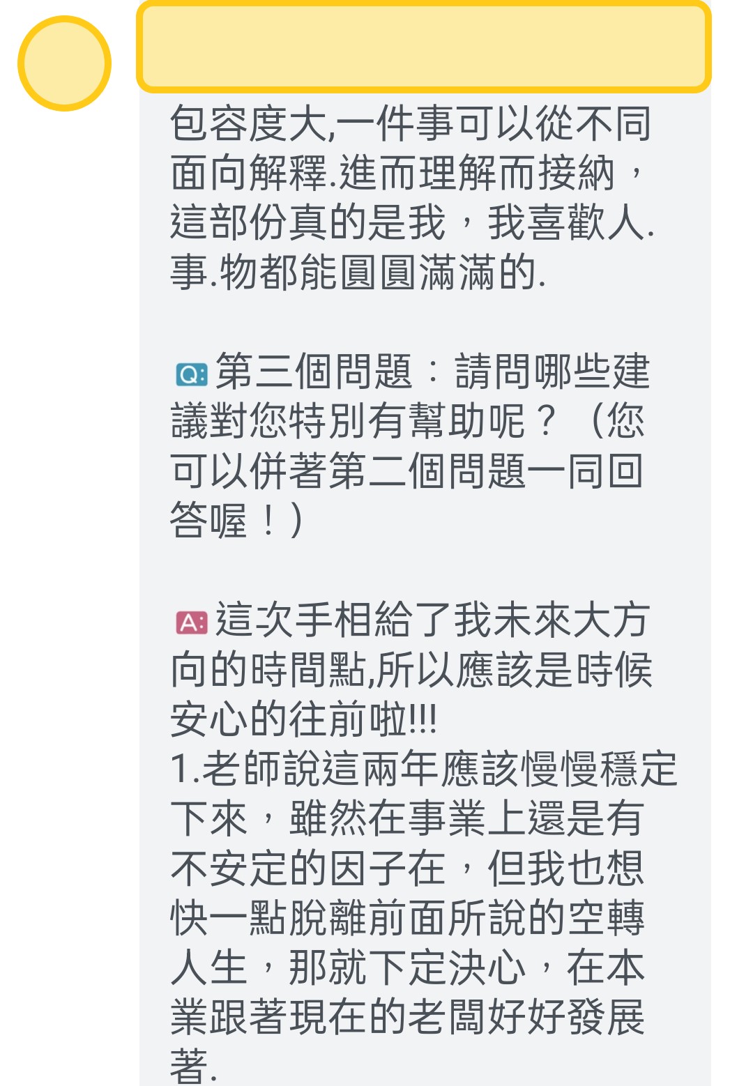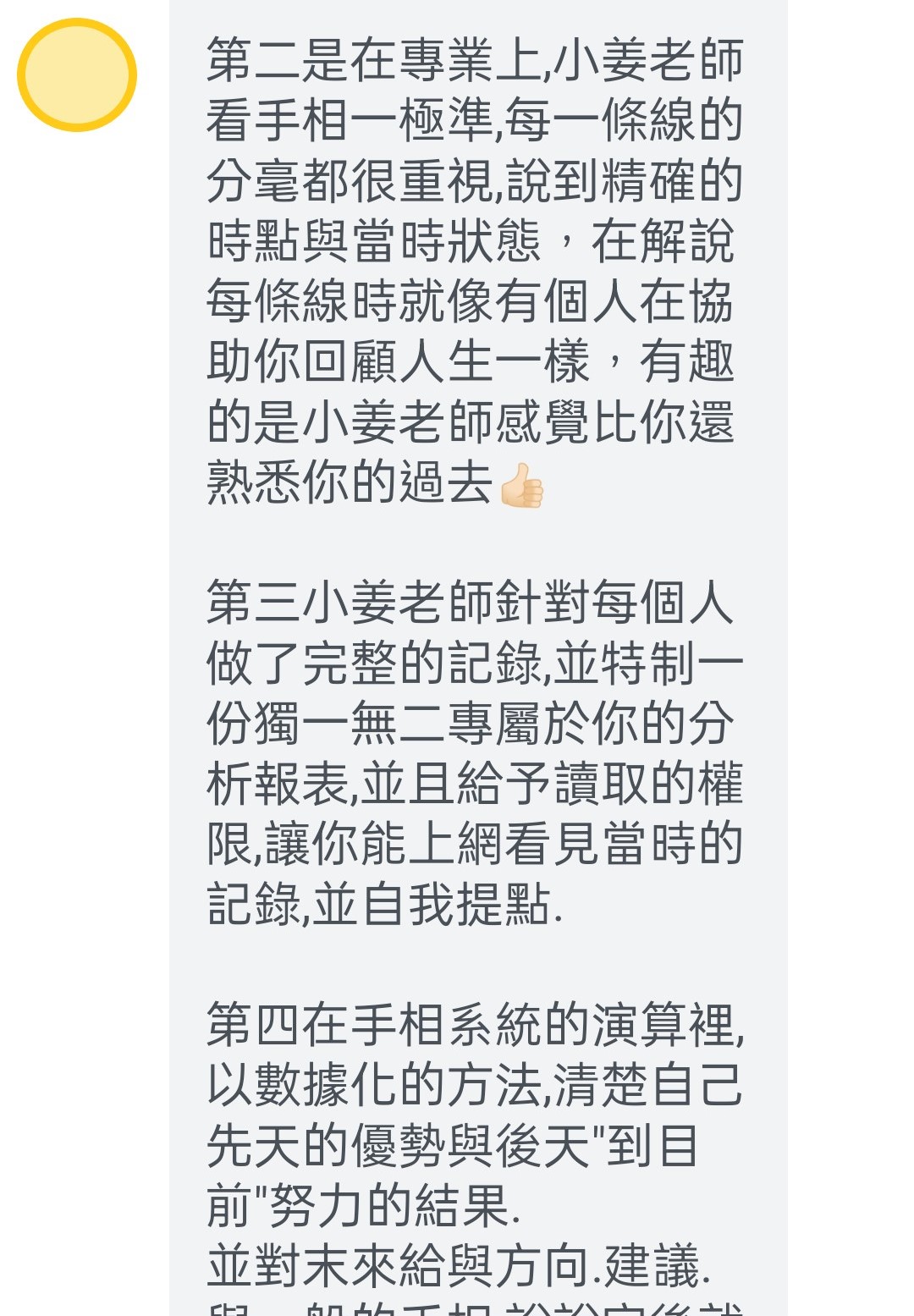 她回覆很多~~~~~超多~~~~~~很認真!如:「有問必答的小姜老師對手相充滿了熱誠」,「協助每個人,在人生的時間軸裡有個大方向的架構,這樣子讓自己在思考與設立人生目標上,有初步的指引」,「小姜老師的售後服務很貼心」,「而且一年有一次對明年的流年提醒唷」,「小姜老師看手相一極準,每一條線的分毫都很重視,說到精確的時點與當時狀態,在解說每條線時就像有個人在協助你回顧人生一樣,有趣的是小姜老師感覺比你還熟悉你的過去」,「對每個人做了完整的記錄,並特制一份獨一無二專屬於你的分析報表」,「以數據化的方法,清楚自己先天的優勢與後天"到目前"努力的結果,並對末來給與方向、建議」,「當然最準的是,看見我這三到五年的迷茫,因為我的選擇性障礙,老天爺給了我很多方面的機會,我下不了決定,要往哪條路而去,所以不斷讓自己的人生空轉」。