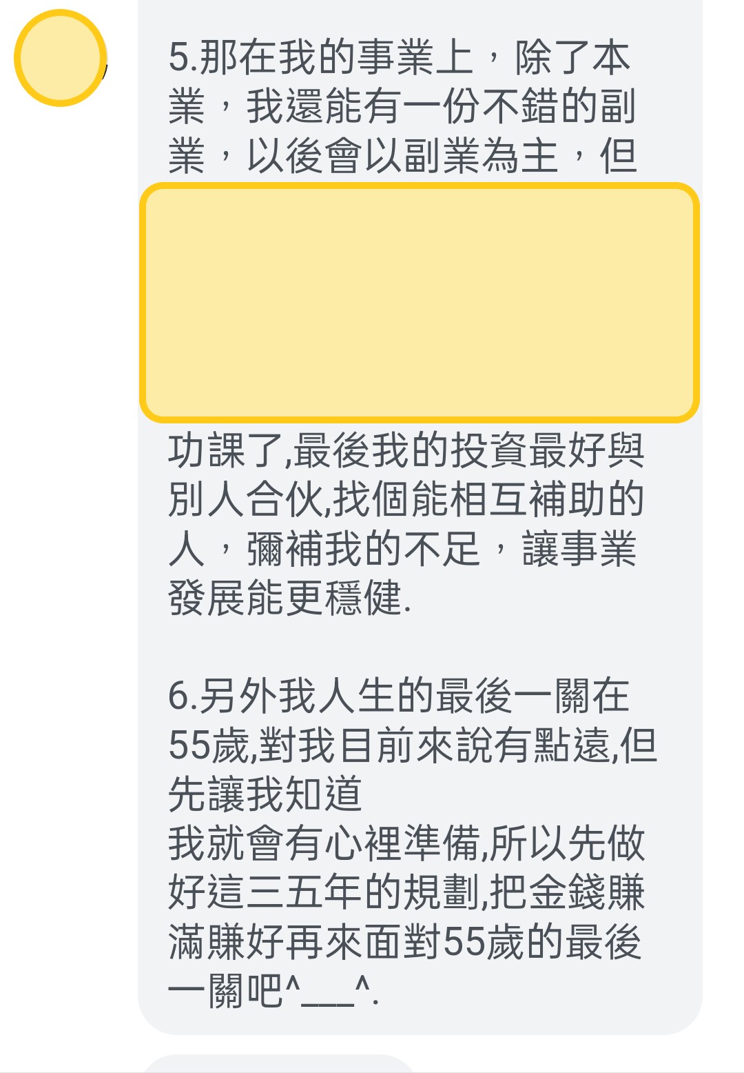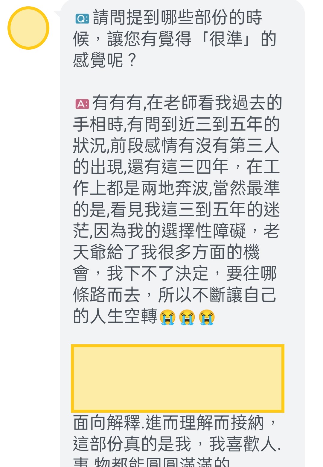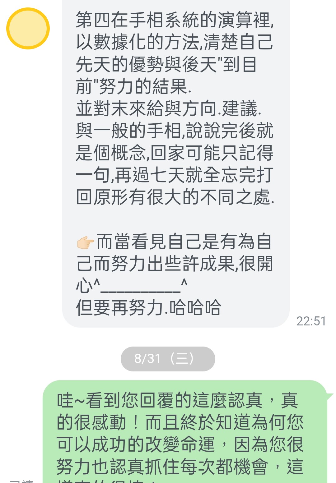 她回覆很多~~~~~超多~~~~~~很認真!如:「有問必答的小姜老師對手相充滿了熱誠」,「協助每個人,在人生的時間軸裡有個大方向的架構,這樣子讓自己在思考與設立人生目標上,有初步的指引」,「小姜老師的售後服務很貼心」,「而且一年有一次對明年的流年提醒唷」,「小姜老師看手相一極準,每一條線的分毫都很重視,說到精確的時點與當時狀態,在解說每條線時就像有個人在協助你回顧人生一樣,有趣的是小姜老師感覺比你還熟悉你的過去」,「對每個人做了完整的記錄,並特制一份獨一無二專屬於你的分析報表」,「以數據化的方法,清楚自己先天的優勢與後天"到目前"努力的結果,並對末來給與方向、建議」,「當然最準的是,看見我這三到五年的迷茫,因為我的選擇性障礙,老天爺給了我很多方面的機會,我下不了決定,要往哪條路而去,所以不斷讓自己的人生空轉」。