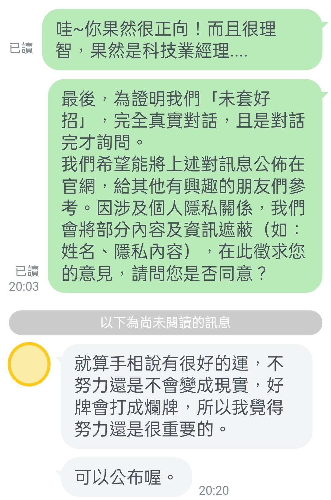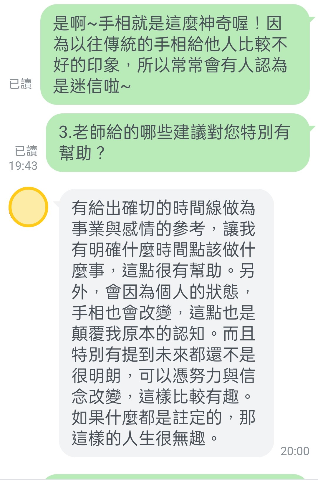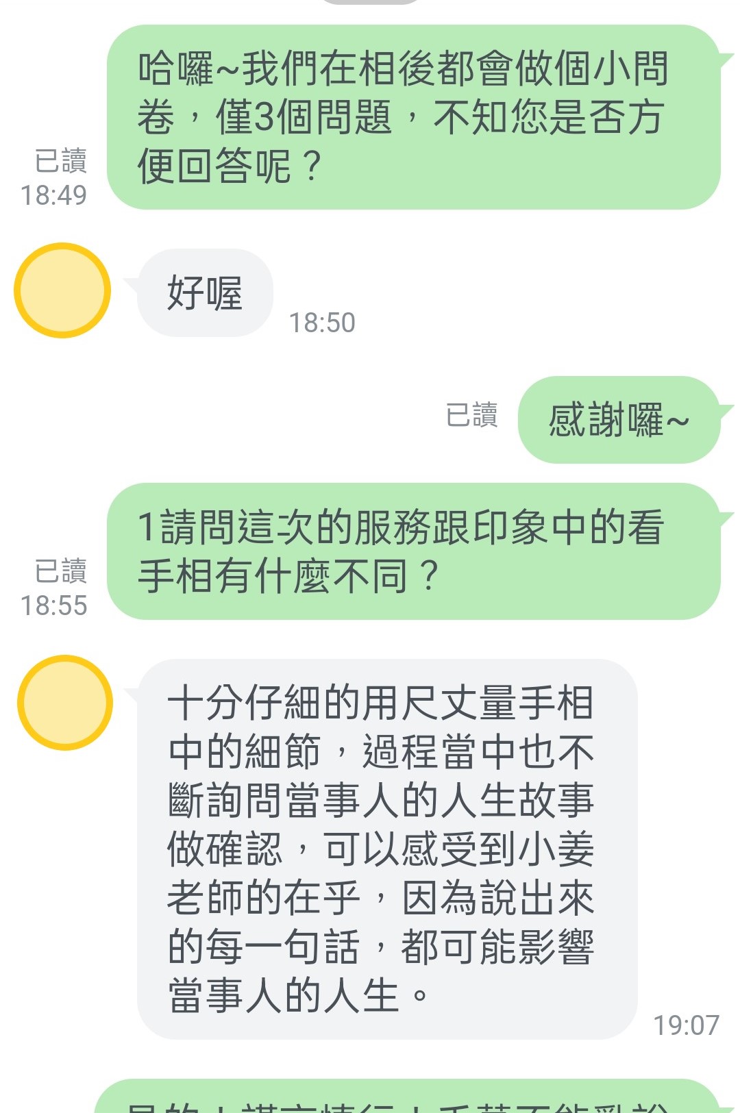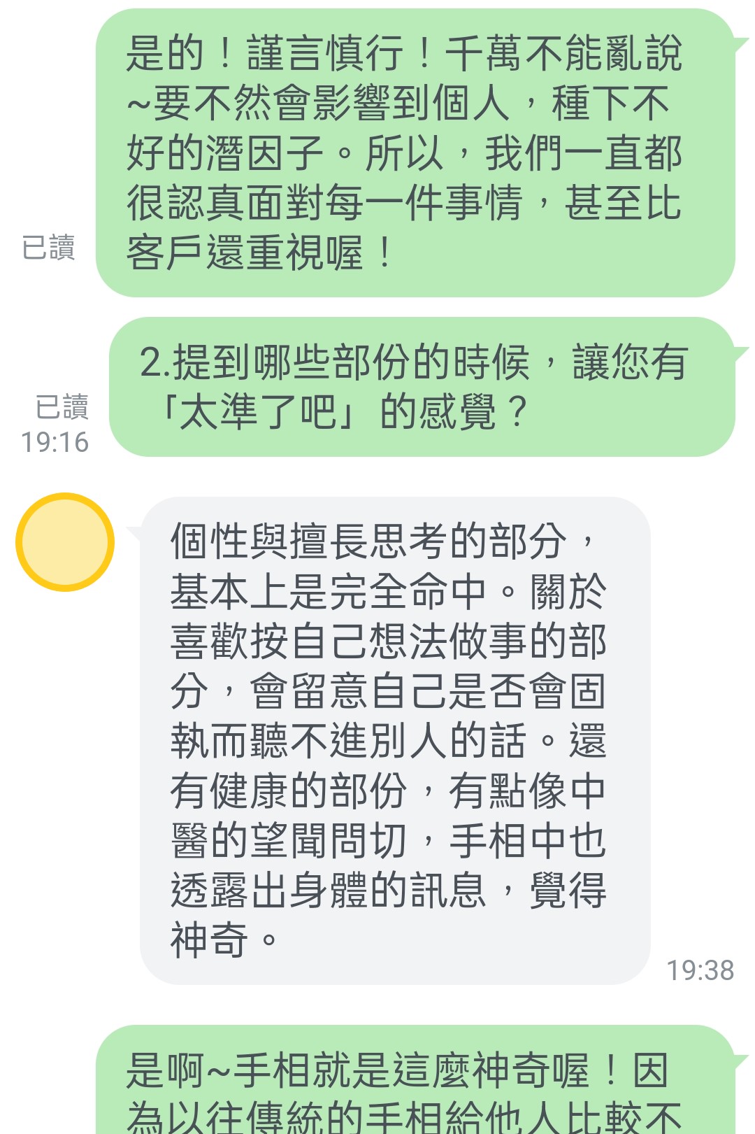 科技業經理!不排斥反而更加篤信! 這次分享的一位客人,也讓老師感到驚艷!這位客人目前在竹科是一位科技大廠的經理喔!看相過程冷靜,也很向學,有時看到一半就會詢問老師一些命理的學理問題,例如:手相的原理是甚麼?為何可以這麼準確?系統怎麼分析這些手相?讓小姜老師也覺得非常特別,也很開心的與他分享~ 他也很明確的回覆看相的感受:「十分仔細的用尺丈量手相中的細節,過程當中也不斷詢問當事人的人生故事做確認,可以感受到小姜老師的在乎,因為說出來的每一句話,都可能影響當事人的人生。」「個性與擅長思考的部分,基本上是完全命中。關於喜歡按自己想法做事的部分,會留意自己是否會固執而聽不進別人的話。還有健康的部份,有點像中醫的望聞問切,手相中也透露出身體的訊息,覺得神奇。」看完相結果滿意,還很開心,富有挑戰精神~ 「有給出確切的時間線做為事業與感情的參考,讓我有明確什麼時間點該做什麼事,這點很有幫助。另外,會因為個人的狀態,手相也會改變,這點也是顛覆我原本的認知。而且特別有提到未來都還不是很明朗,可以憑努力與信念改變,這樣比較有趣。如果什麼都是註定的,那這樣的人生很無趣。」 這算是小姜老師看相客人中,很具有高水準的態度及思考邏輯!果然行走竹科的都不是蓋的~