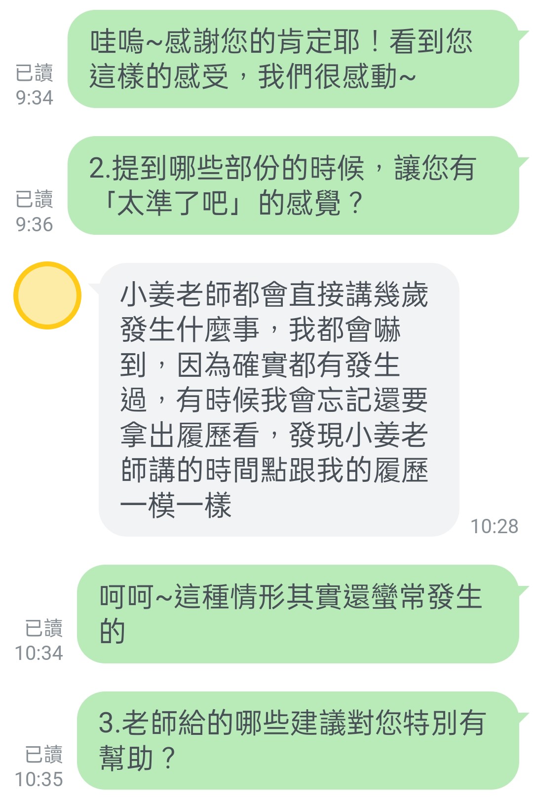 最後,小姜老師也會用多年來累積的豐富經驗給予建議喔~ 如果怕忘記的朋友們也不用拿著筆記本抄抄寫寫的甚至還要錄音,官網上都會幫你們詳細註明喔! 來到【汝來神掌】就只要專注的和小姜老師溝通和思考自己未來的人生就足夠啦!