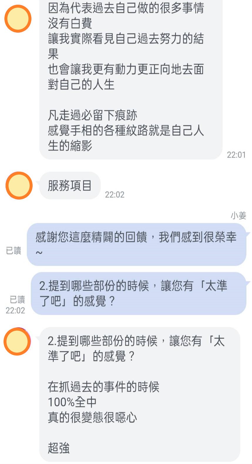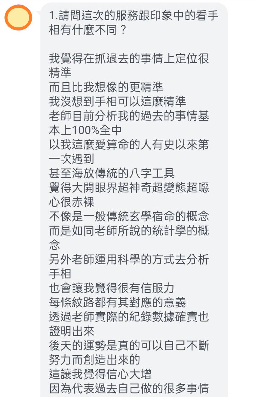 這位客人也對老師科學的手相分析堅信不移,對自己未來的人生充滿了信心。 看到他能持續努力,積極面對人生各種挑戰,小姜老師也是超級開心! 因為能真的幫助到他人,這是一種幸福感喔~ 還沒「手相回看」的神掌們!該回來健檢啦~ 有疑惑的朋友,別再猶豫囉~