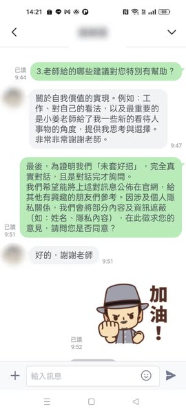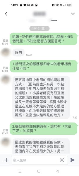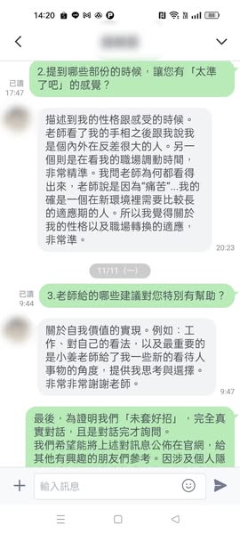 長期在不開心的工作下,工作了半輩子,為了生活又不敢換工作,老師給他一些關於人生方向的建議,讓他聽完後對人生充滿信心!小姜老師沒有很直接又武斷地說我幾歲怎樣!...感覺比較像是正在光線不太足夠的地方整理各種線,而小姜老師幫忙將燈光調亮,並指出糾結雜亂的地方。老師跟我說我是個內外在反差很大的人,另一個則是在看我的職場調動時間,非常精準。