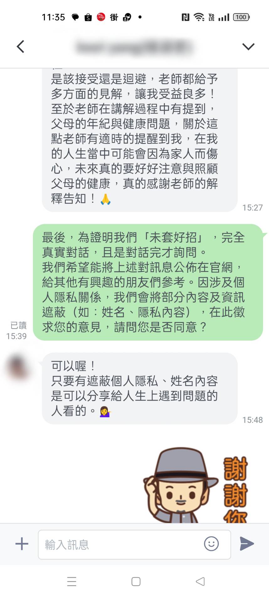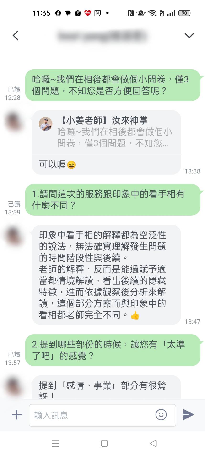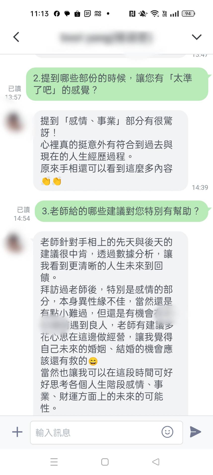 改變傳統印象,體驗數據分析 這次與我們分享的是來自台北市的公務員管小姐(化名)。 管小姐對於手相的印象,覺得都是以空泛性的說法,然後無法理解發生問題的時間先後關聯。但這次體驗小姜老師看手相後的解說、分析,竟然讓管小姐看到更清晰的未來人生,尤其提到「感情」與「事業」的部分,著實驚訝,原來手相還可以看到這麼多的資訊。 最後,小姜老師針對手相上先天與後天的建議也很中肯,非常樂意將此次體驗與人生上遇到問題的朋友們分享,大家也可以預約體驗看看喔^^