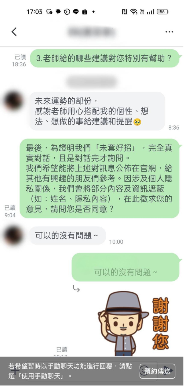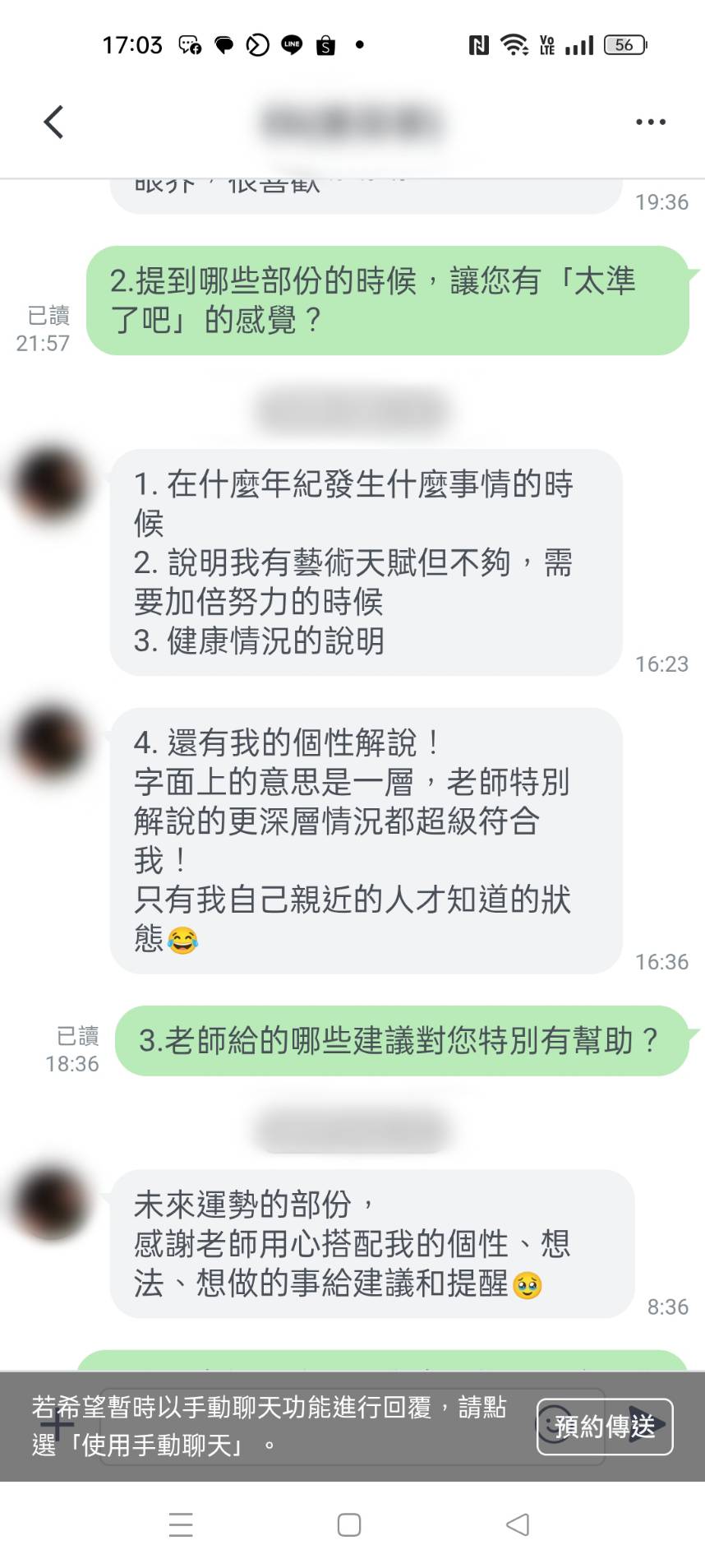 最讓老師感動的是,王先生覺得這次的諮詢充滿了耐心與關懷;我們不只驗證過去,更針對他的個性與想法,給出了未來運勢的具體建議。